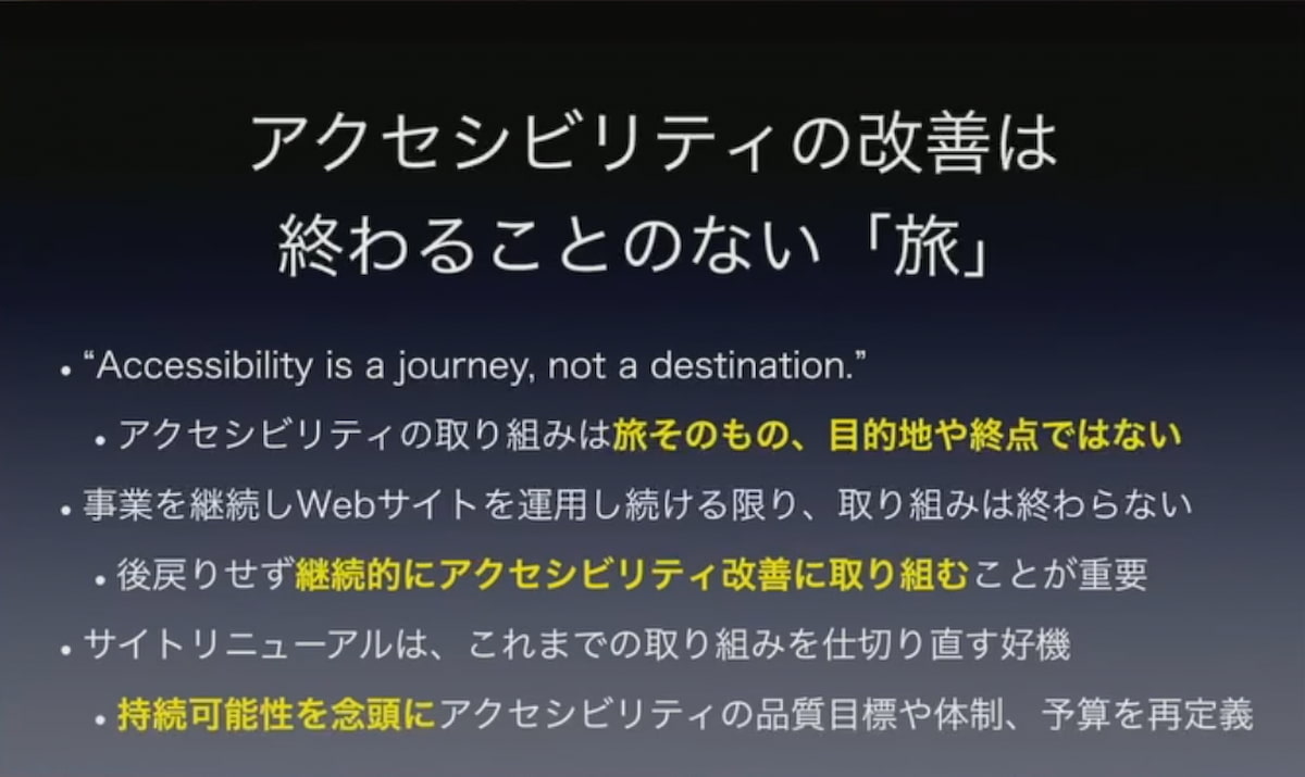 木達氏は、「Accessibility is a journey, not a destination.(アクセシビリティはジャーニー〔旅〕であり、目的地ではない)」という言葉を引用し、Webサイトを運用し続ける限り、アクセシビリティへの取り組みは終わることがないと強調した。サイトリニューアルは、これまでの取り組みを仕切り直し、持続可能性を念頭に、目標設定や体制、予算を検討する絶好の機会であると締めくくった。