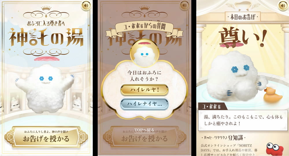今回の特別コンテンツ「おふろに入る尊き者へ 神託の湯」は、SNS上で話題の「おふろキャンセル」に対し、「ユ・ポポ」様が“ありがたいお言葉(ボイス)”を授けてくれる企画。「今日はおふろに入れそうか?」という問いに対して「ハイレルヤ!」を選ぶと、全25種類のお告げがランダムで再生される。ノーリツ製の給湯器を使っていなくても、特設サイトから体験可能だ。