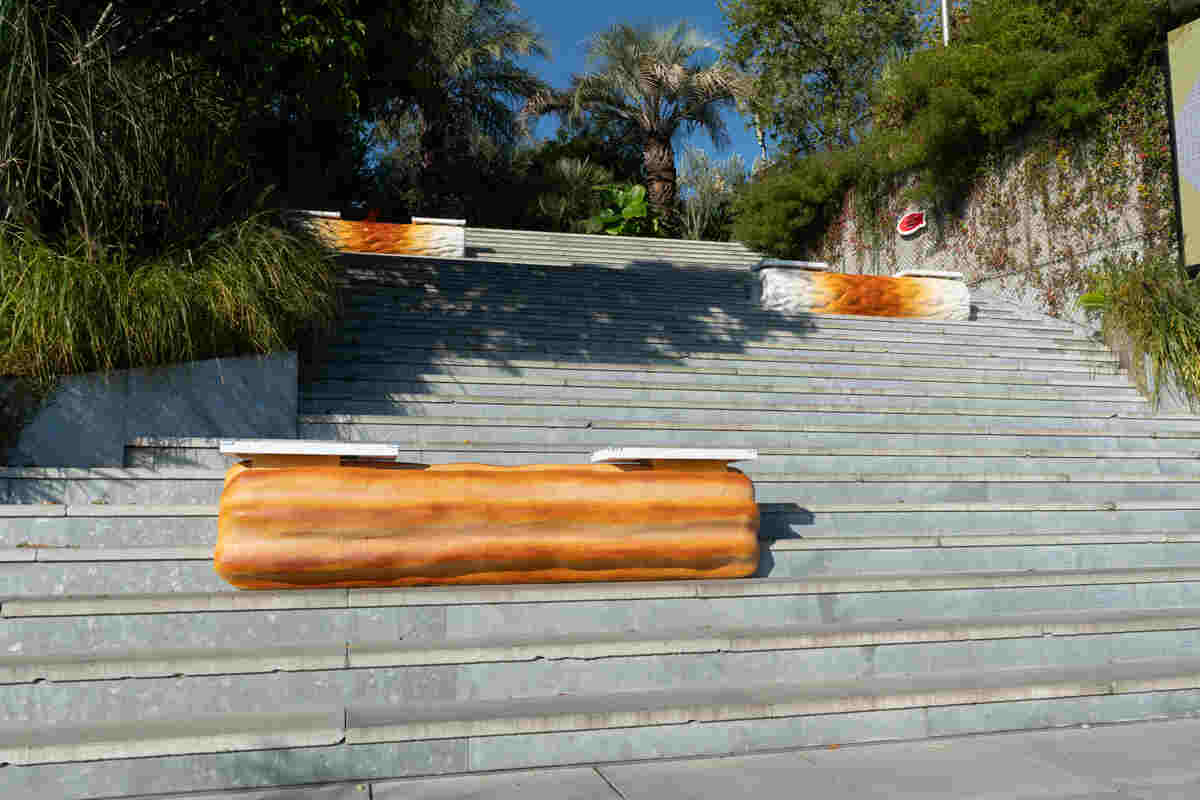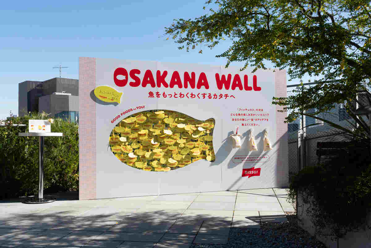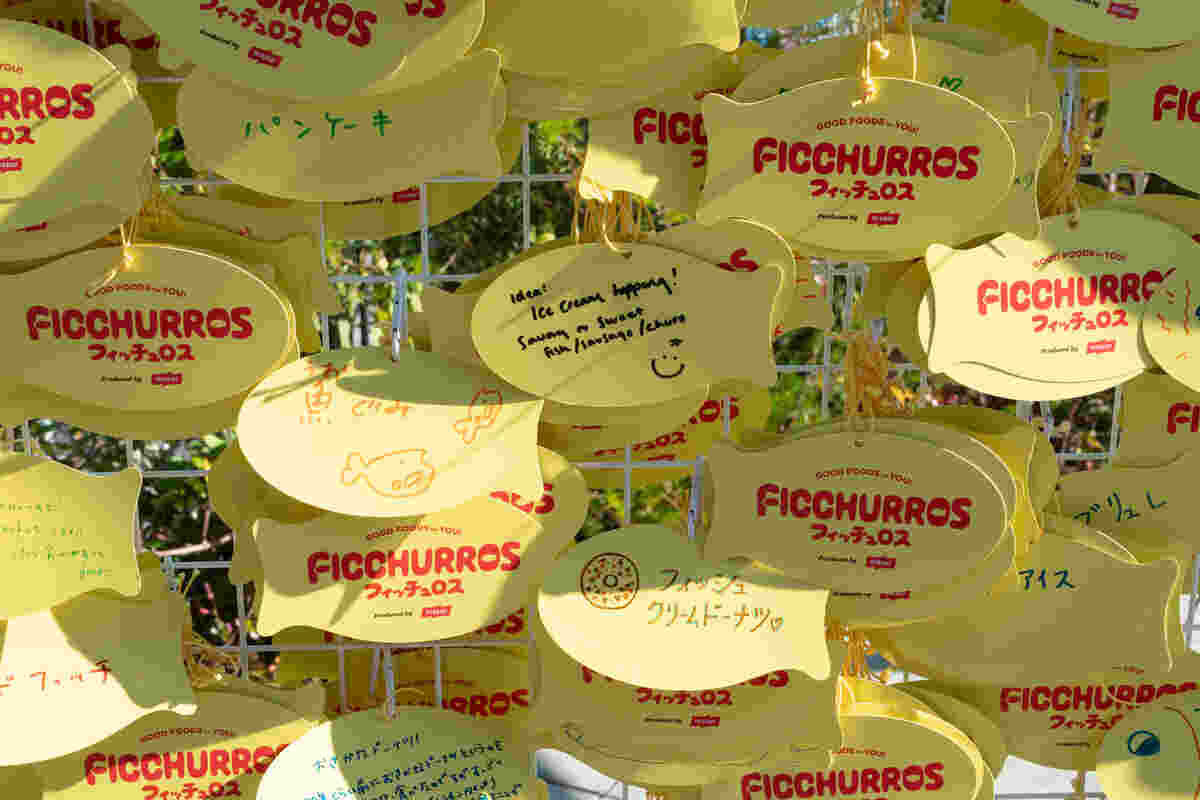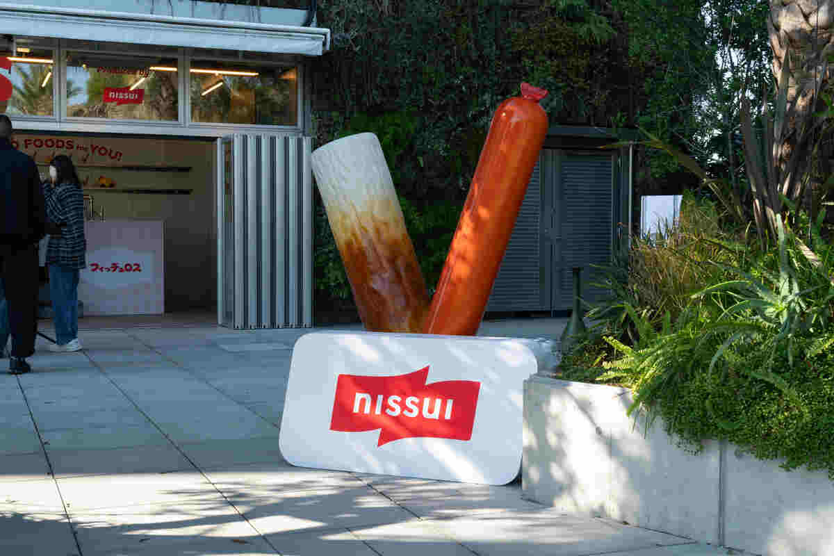 会場となったハラカド屋上テラスには、「おさかなのソーセージ」「おいしいものをちょっとだけ」、そしてフィッチュロス2種をモチーフにした巨大オブジェを設置。ファッショナブルなビジュアルを用いることで、来場者が思わず写真を撮りたくなる空間を演出した。