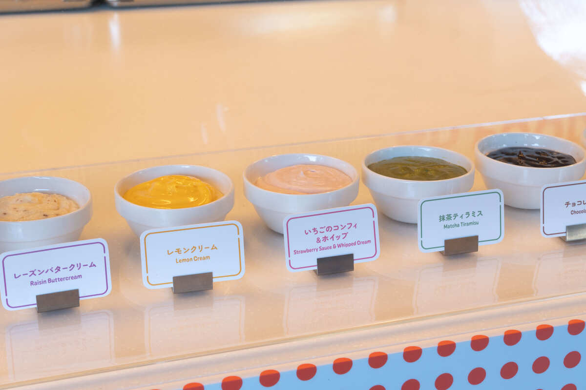 開発段階で考案された30種のソースの中から厳選。レーズンバタークリーム、レモンクリーム、いちごのコンフィ&ホイップ、抹茶ティラミス、チョコレート、アイオリバジル、たくあん&クリームチーズ、わさびクリームの計8種を展開した。