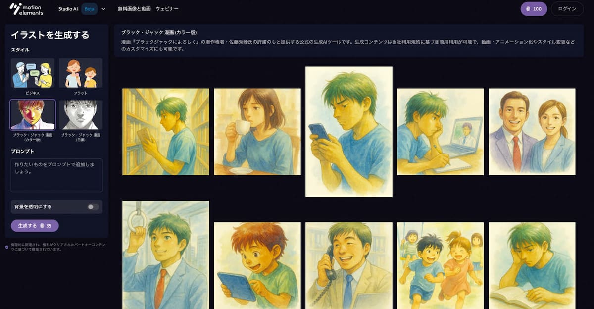 動画、音楽、テンプレートなどの素材マーケットプレイスを運営するモーションエレメンツは9月、佐藤秀峰さんによる漫画『ブラックジャックによろしく』の絵柄を学習したAIイラスト生成ツールを公開した。