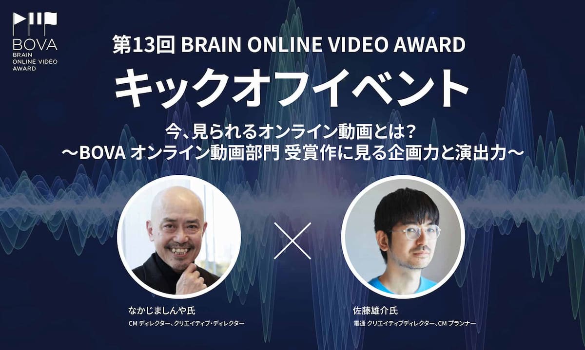 それに合わせて、12月5日には動画制作のヒントを得られるキックオフイベントが開催される。登壇するのは、第13回「BOVA」オンライン動画部門の最終審査員である、なかじましんや氏と佐藤雄介氏。過去の受賞作を事例に、審査で着目した企画・演出のポイントを解説し、今の時代に“見られる”オンライン動画に求められる要素を紐解く。BOVAへの応募を検討している方、企画・制作に携わる方にとって、ヒントとなる内容を幅広くお届けする。