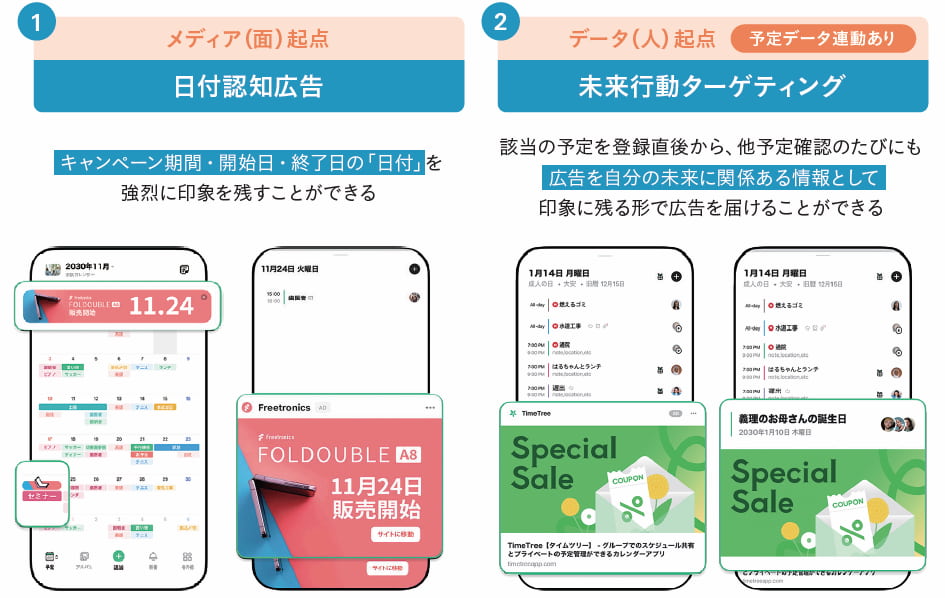 新保:「日付認知広告」と、予定を基にターゲティングする「未来行動ターゲティング」の2つです【図表】。前者は日付が重要なプロモーションで効果を発揮します。例えば、ECサイトのセール告知などで日付認知のリフトや高いROASを記録しています。