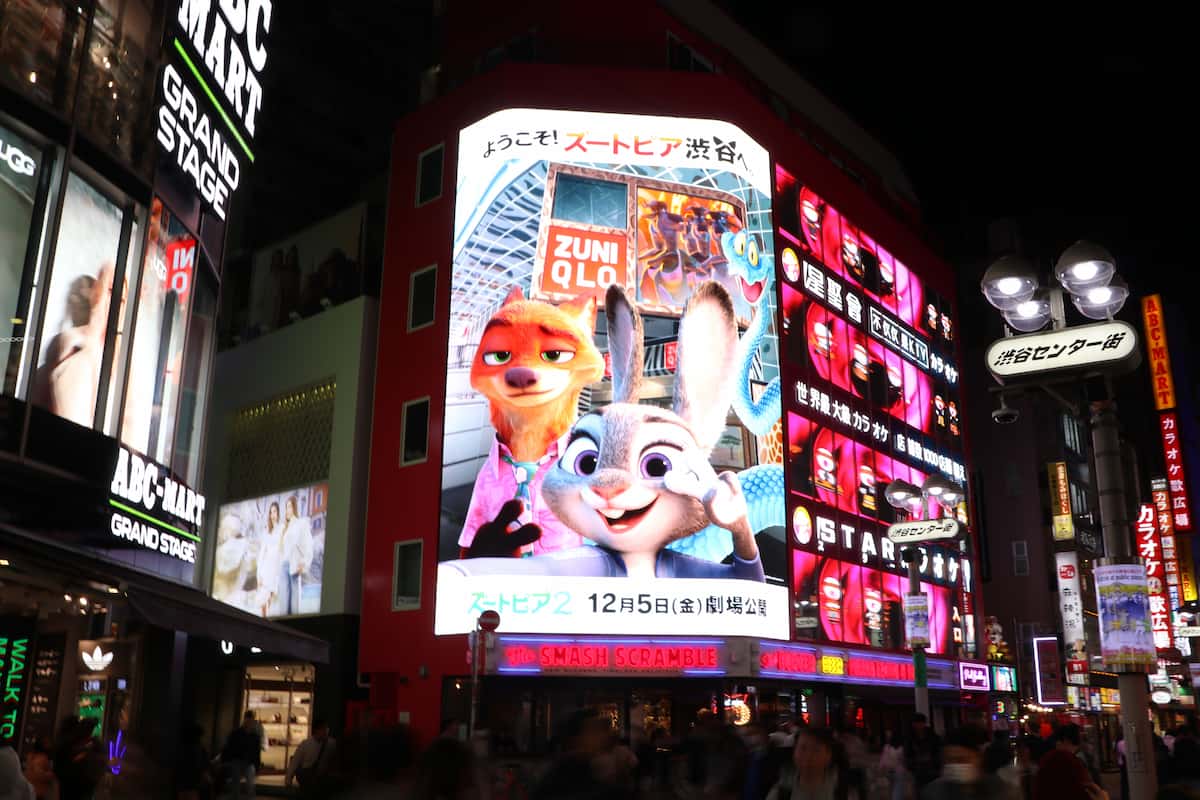 SHIBUYA TSUTAYA の外壁には巨大なパロディビジュアルが掲出され、センター街の大型ビジョンやバス停のデジタルサイネージでもさまざまな“ズートピア化”広告が放映されている。映画の持つユーモアと親しみやすさを、生活者が日常的に目にするブランドと重ね合わせることで、街そのものが映画の舞台へと変化していくような錯覚を生み出しているのが特徴だ。