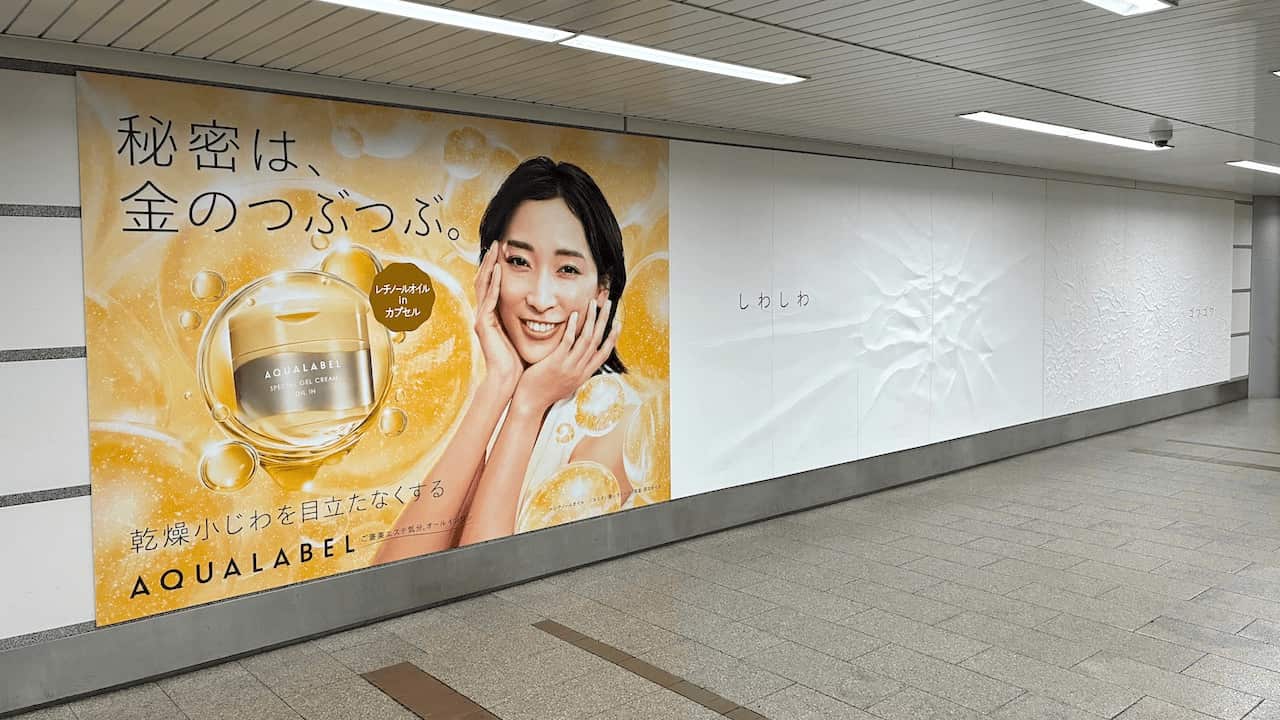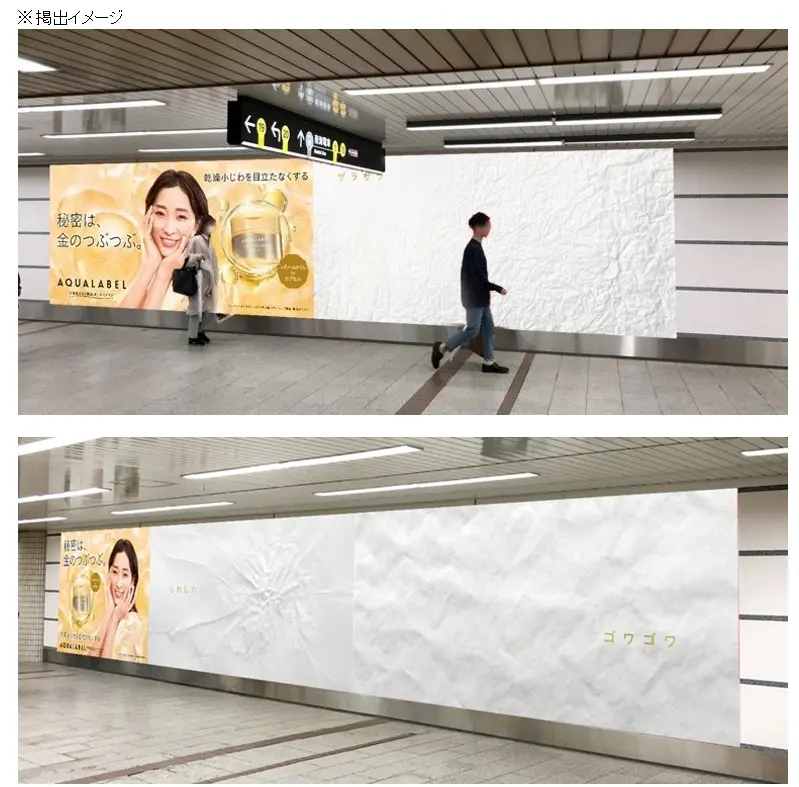 「“乾燥による小じわ悩みには金のアクアレーベル”ということを伝えるために、『しわしわ』『ヨレヨレ』『ゴワゴワ』『ザラザラ』という4つの“しわ”オノマトペを、立体的なテクスチャで表現したOOHです。遠目にはただの白い壁に見えますが、近づくと物理的な凹凸が照明を受けて『しわ』や『ザラつき』の陰影が浮き上がります。 そんな『発見の瞬間』をつくることで、駅を行き交う人が『なんだろう?』と思わず足を止める、触って体験できる、直感へ響くOOHを設計しました」(小森氏)。
