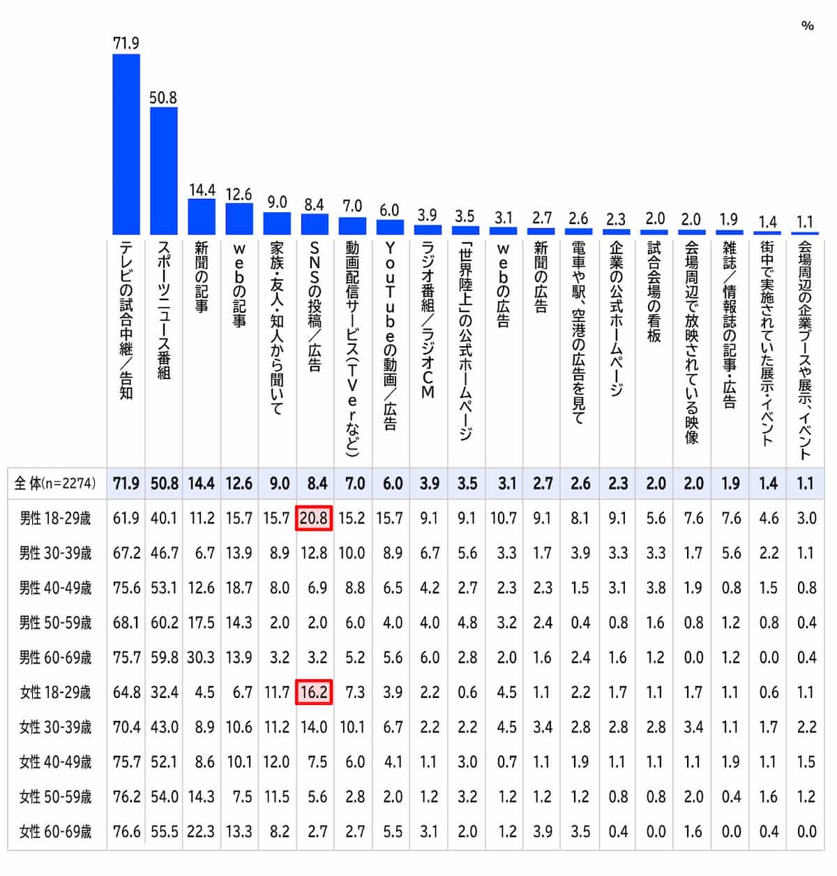 情報接触メディアでは「テレビ中継・告知」が71.9%と最多。続いて「スポーツニュース番組」(50.8%)、「新聞記事」(14.4%)、「Webニュース」(12.6%)が続いた。一方、若年層では「SNS投稿・広告」を通じて情報を得た人の割合が比較的高く、接触メディアの多様化が進んでいることがうかがえる。