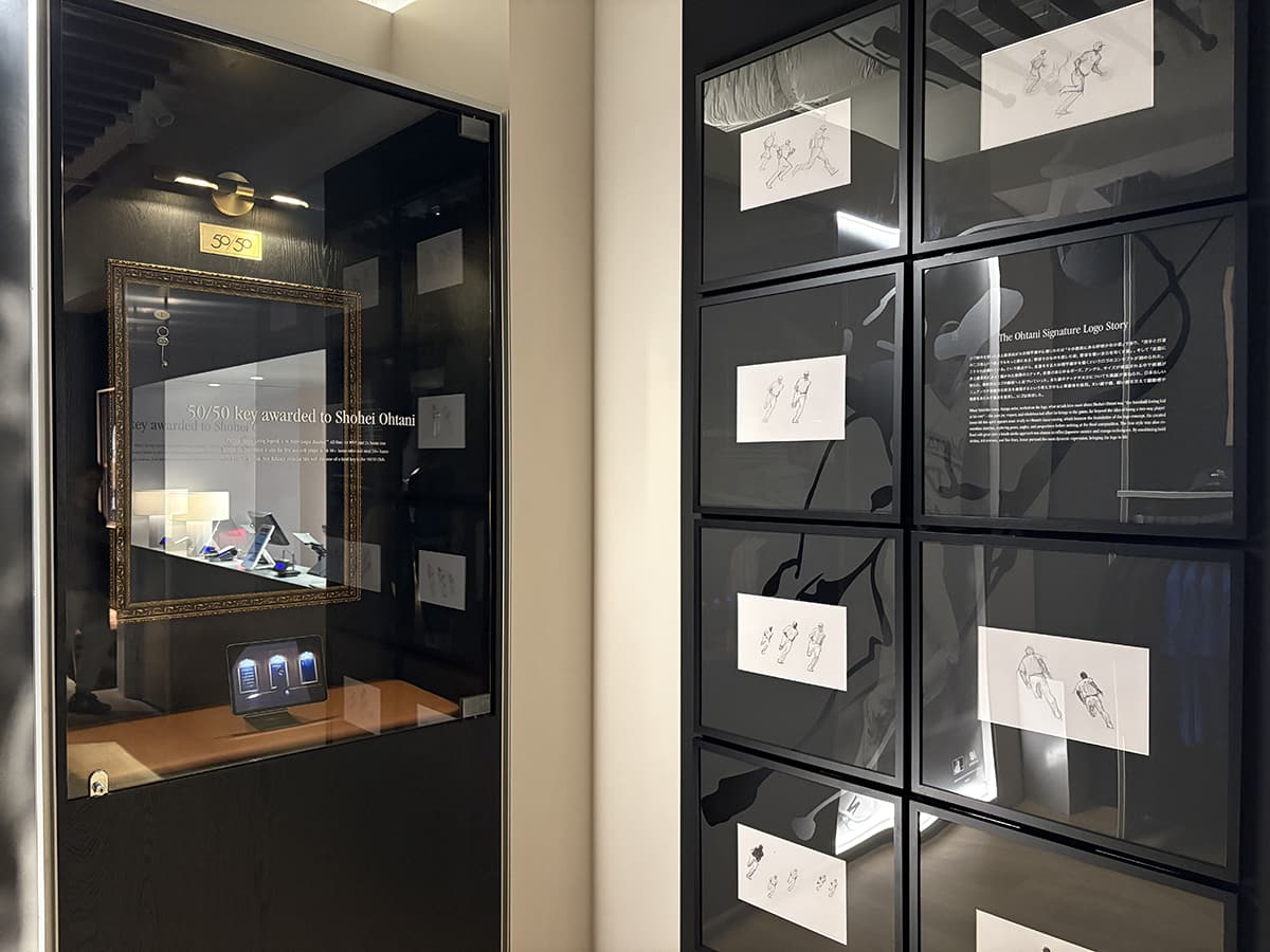 メジャーリーグにおいて、1シーズンに50本塁打と50盗塁を同時に達成した歴史的な偉業を成し遂げた選手のみが入会できる架空のクラブ「50/50 club」。現時点でメンバーは大谷翔平選手のみ。その歴史的クラブへ入るための「鍵」が飾られている(写真左)。またマンガ『スラムダンク』『バカボンド』などの作者の井上雄彦氏が手がけたシグネチャーロゴの制作過程がわかる原画(写真右)