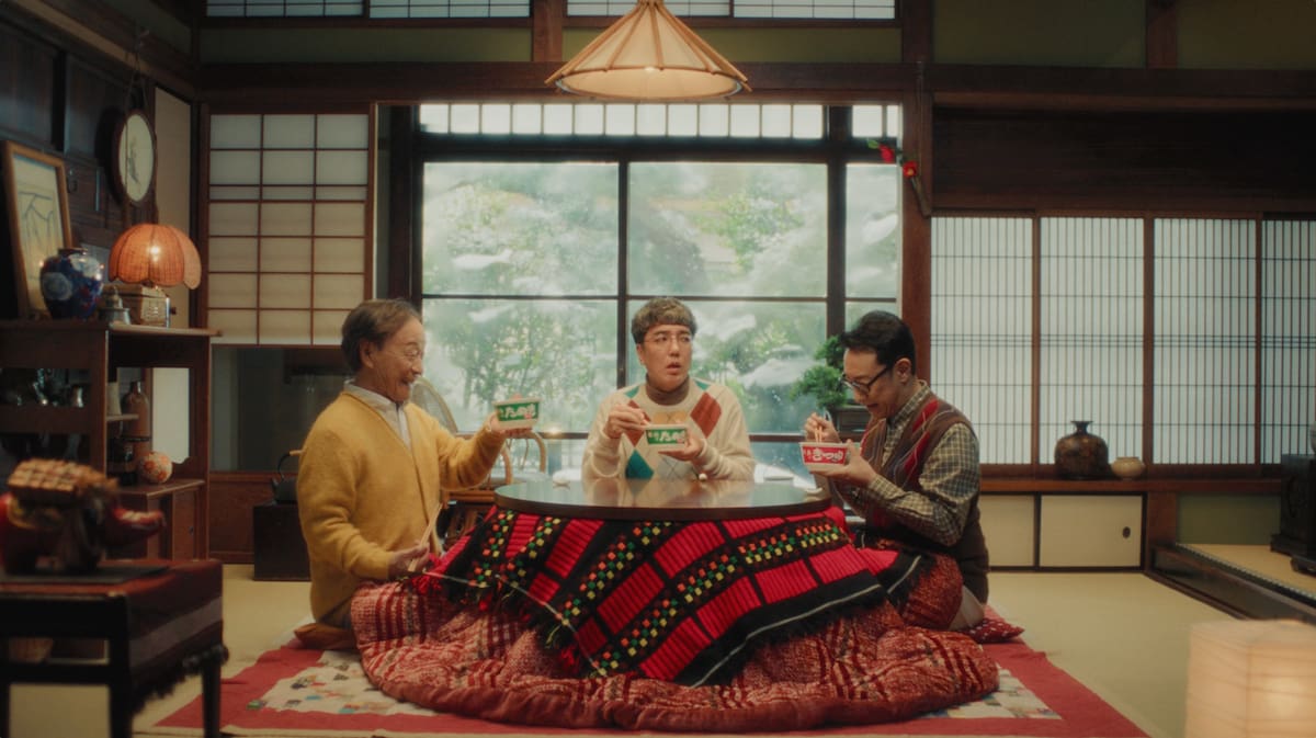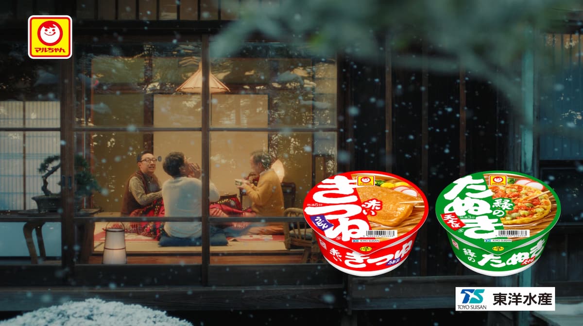 東洋水産は、「マルちゃん 赤いきつね緑のたぬき」の新テレビCM「年末のつどい」篇を12月8日より放映開始する。同ブランドのイメージキャラクターを45年以上務める武田鉄矢さんに加え、今回は俳優としても活躍するおぎやはぎの小木博明さん、東京03の角田晃広さんが出演する。
