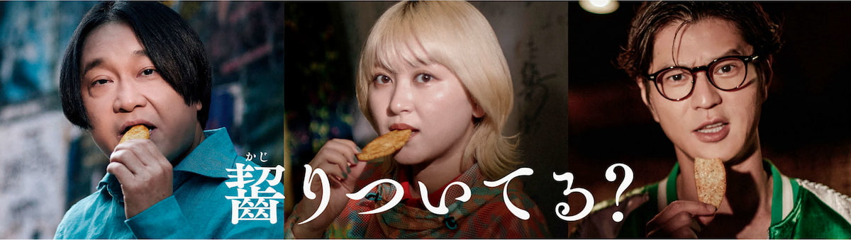 新CMは、「齧りついてる?」をテーマに、3名の芸人がそれぞれ自身の縁の地でばかうけに齧りつく姿をシンプルに描写した映像と、齧りつくその人の人格を客観的に語るナレーションで構成した。