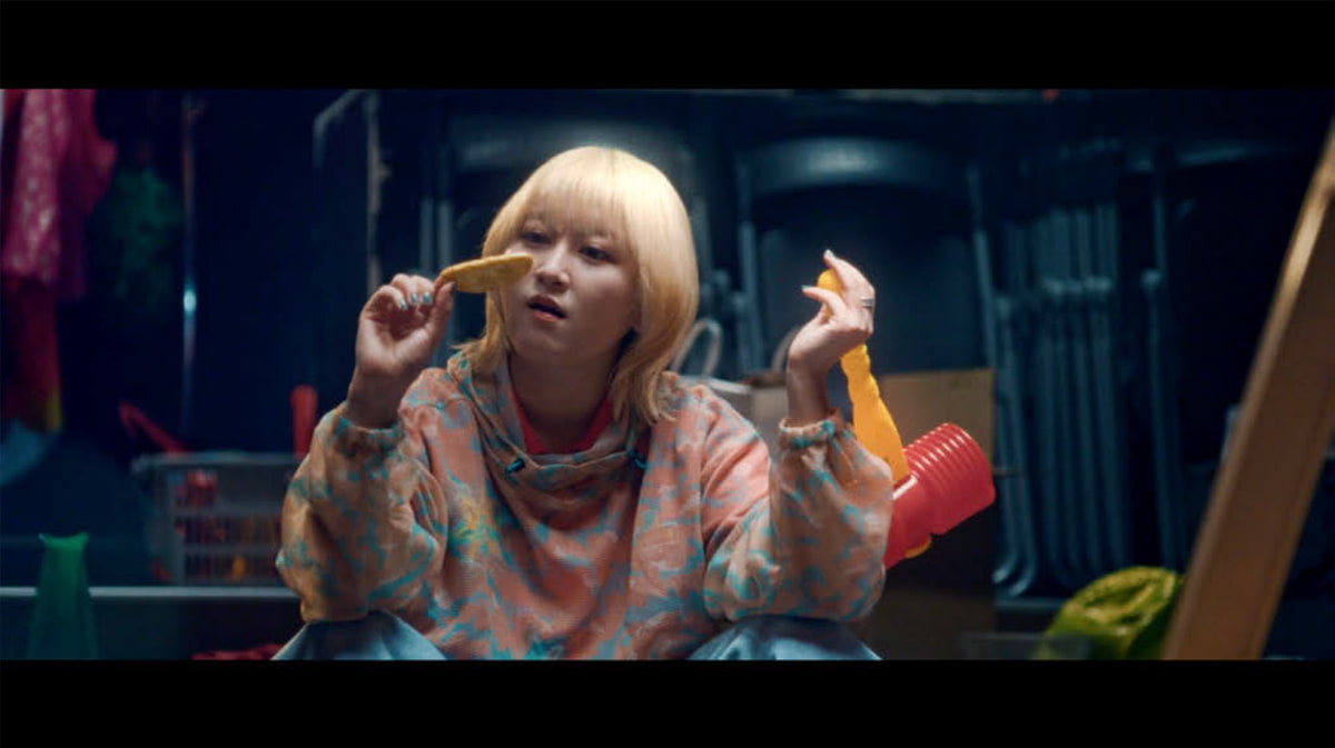 映像にサーヤさん、ナレーションに永野さんが出演するCMのキャプチャ。サーヤさんが駆け出しのときにライブでよく出演していたシアター・ミネルヴァでばかうけに齧りつき、ナレーションでは永野さんが「サーヤはハンター。とにかく興味があるところに“まっすぐいく”人」と、サーヤさんの印象について語っている。