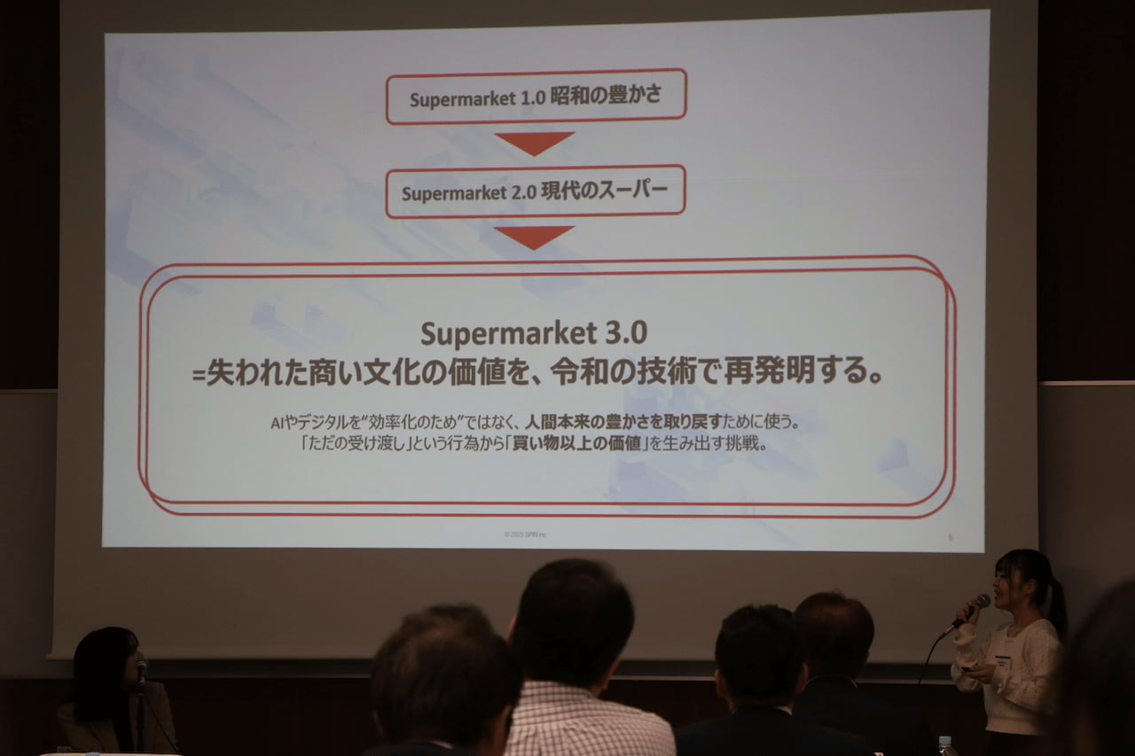 同じく「ベストチャレンジ賞」一般の部には、スピン AE事業ユニットの清水佑輔さん、甲斐郁美さん、馬場遼太さん、池田ゆいさんによる「Supermarket 3.0 — 商い文化の再発明 ~AIと人がつくる『買い物以上の価値』~」が選出された。スーパーマーケットの無人化やキャッシュレス化といった環境変化を踏まえ、AIと人が共創する“買い物を超えた体験価値”の将来像を提示した点が評価されている。