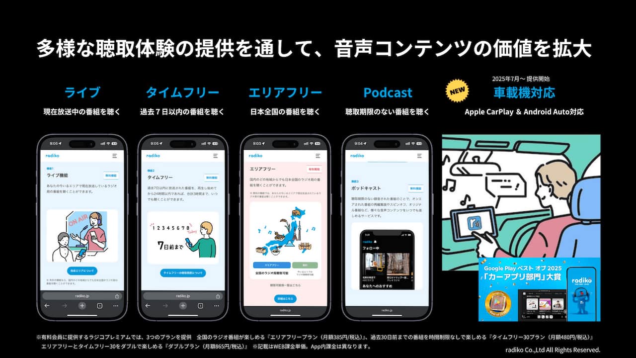 ライブ配信、タイムフリー、エリアフリーといった既存サービスに加え、好調なポッドキャスト、さらに2025年7月にはApple CarPlayとAndroid Autoに対応したアプリをリリースした。このカーアプリは「Google Play ベスト オブ 2025」でカーアプリ部門の大賞を受賞するなど、ラジオ聴取体験の拡張を進めている。