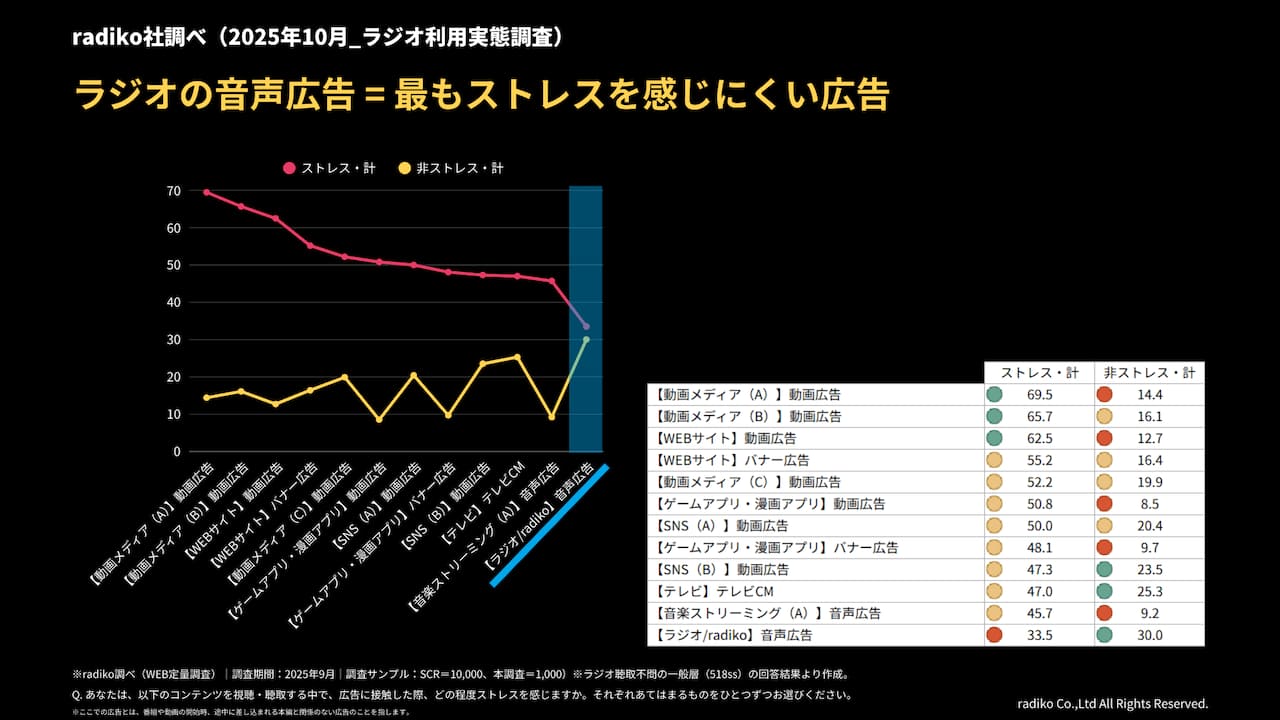 さらに嶋氏は、調査から得られたもう一つの重要な発見として、「ラジオの音声広告は、最もストレスを感じにくい広告である」という結果を報告した。