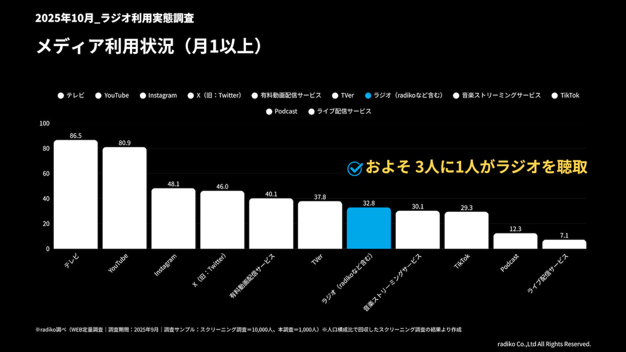 さらに、週1回以上radikoを利用するユーザーは、一般層よりもさらに広告に対するストレスが低く、受容性が高いことも判明した。リーチ面では、テレビやYouTubeには及ばないものの、月1回以上の接触者は全体の3分の1以上を占め、TVerや音楽ストリーミングサービスと同程度の規模を持つメディアであると明かした。
