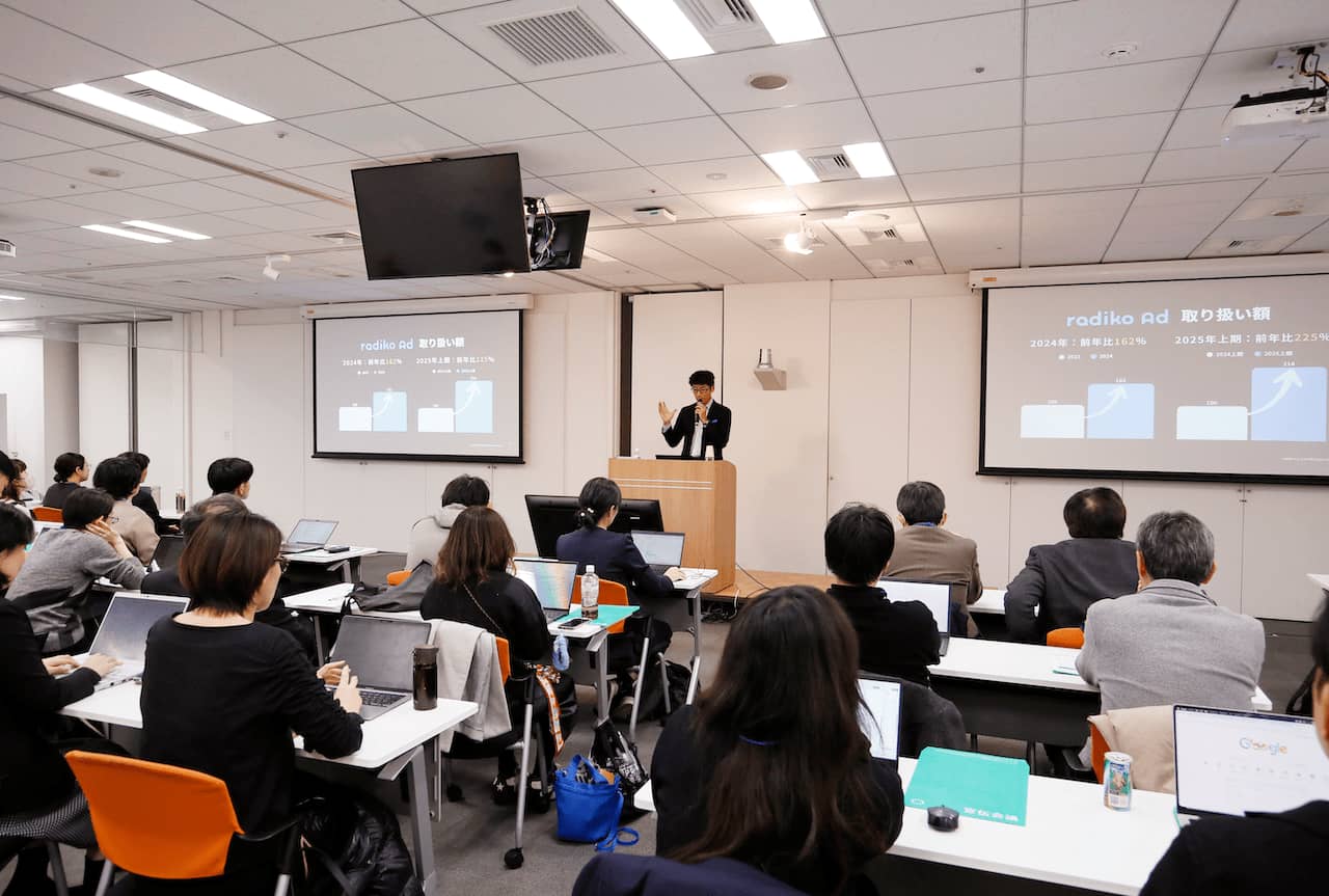 radiko は2025年12月でサービス開始から15周年を迎えた。現在の月間利用者数は約850万人で、1日あたりの利用時間が130分以上と非常に長いことが特徴。有料会員も約110万人に達し、全国のラジオ局の番組が聞ける「エリアフリー」や聞き逃した番組が聞ける「タイムフリー」といったサービスが活用されていると語った。