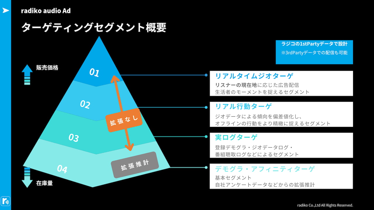 radikoは、ターゲティング可能な音声広告商品「radiko audio Ad」を提供している。これは、ラジオ局から提供された広告枠(番宣スポットなど)を、radikoの保有するデータに基づき、ユーザーごとに最適な広告に差し替えて配信する仕組みだ。