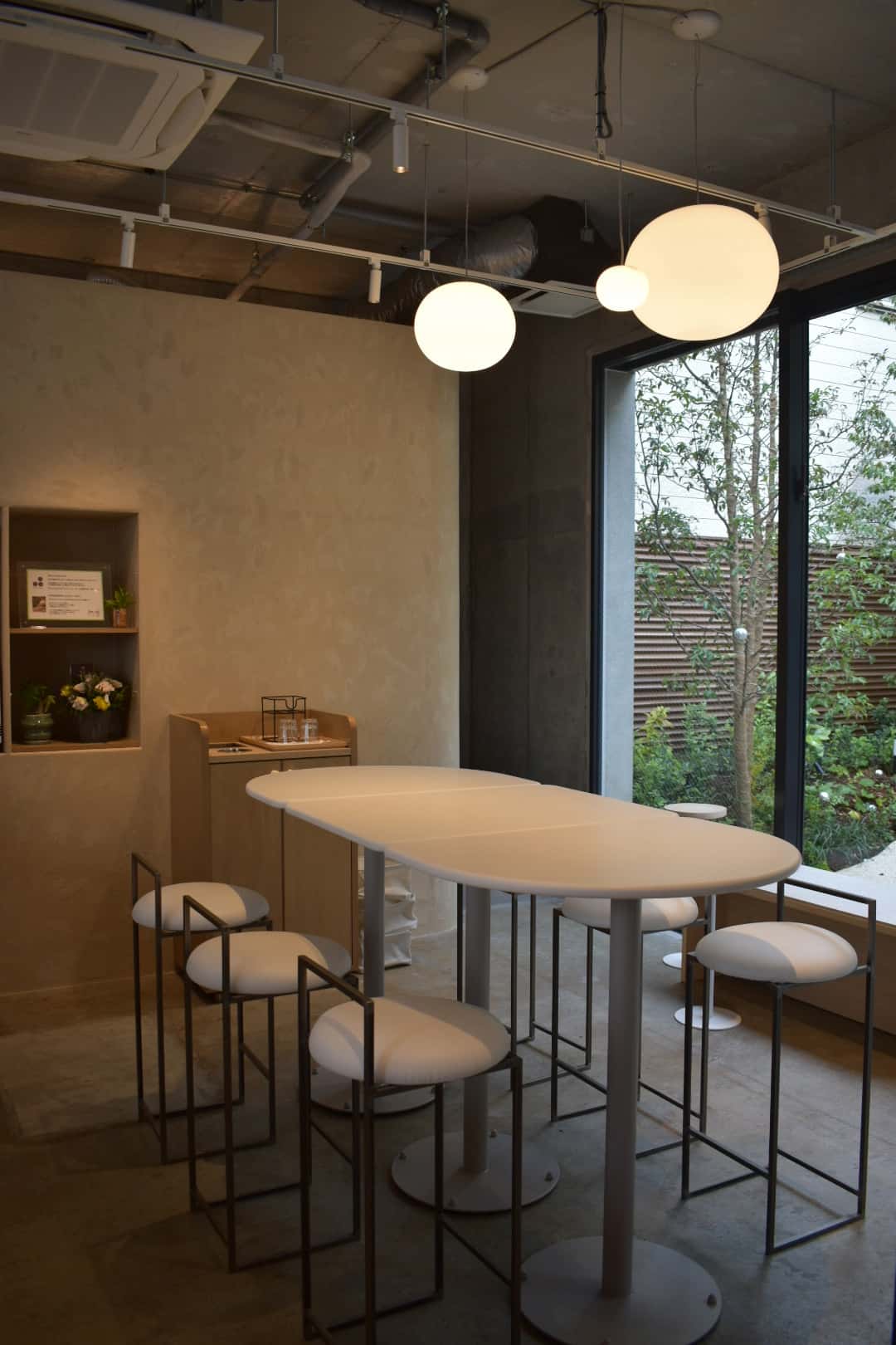 店舗デザインでは、『NAKAMICHI GARDEN』の特徴である中庭と、3面ガラス張りの店舗構造を活かし、左官仕上げのカウンターを中道通り沿いに象徴的に配置。テイクアウト利用も含めて、気兼ねなく来店してもらえる構造にしました。また、店舗ロゴの3つの円をモチーフにしたカウンターテーブルをはじめ、ミルクカラーである白を基調とした配色と温かみのある照明を取り入れることで、外から見ても中に入っても、等身大の自分でいられる心地よい空間を目指しました」(中島氏)。