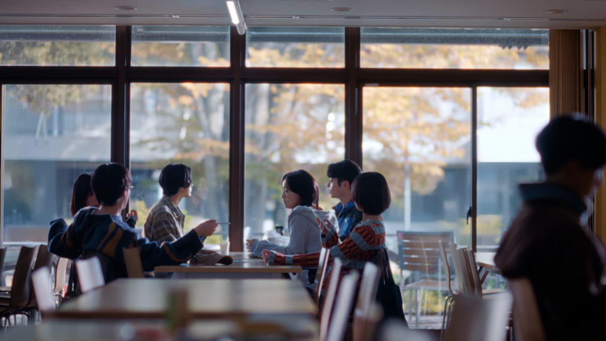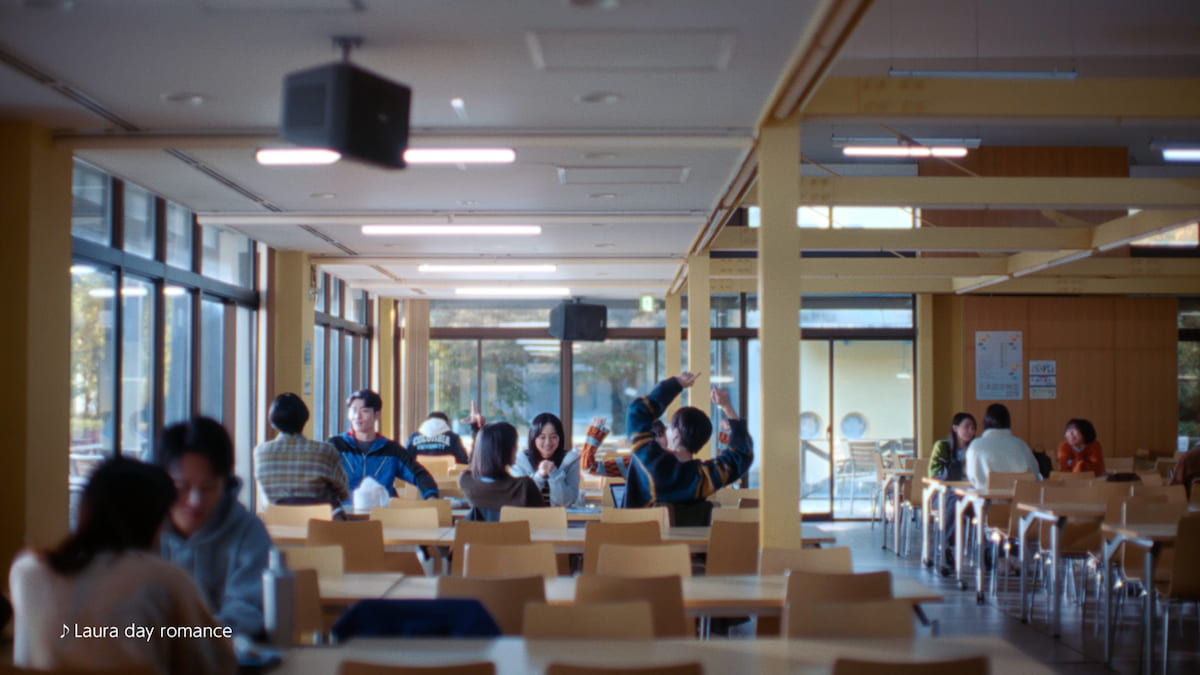 「今年度のJR SKISKIでは2本のCMを制作しました。12月に公開された『準備篇』では、スキー旅行を計画する大学生6人組の会話劇で、これから雪山へ向かうワクワク感とともに、4年生にとっては『大学最後の冬』になる儚さを少しだけ感じさせたいと思いました。会話劇なのですが、今回ヒロインはセリフなし。表情だけで演技してもらうことで、逆に存在感や先輩との関係性をアピールする形にしてみました」(山口氏)。