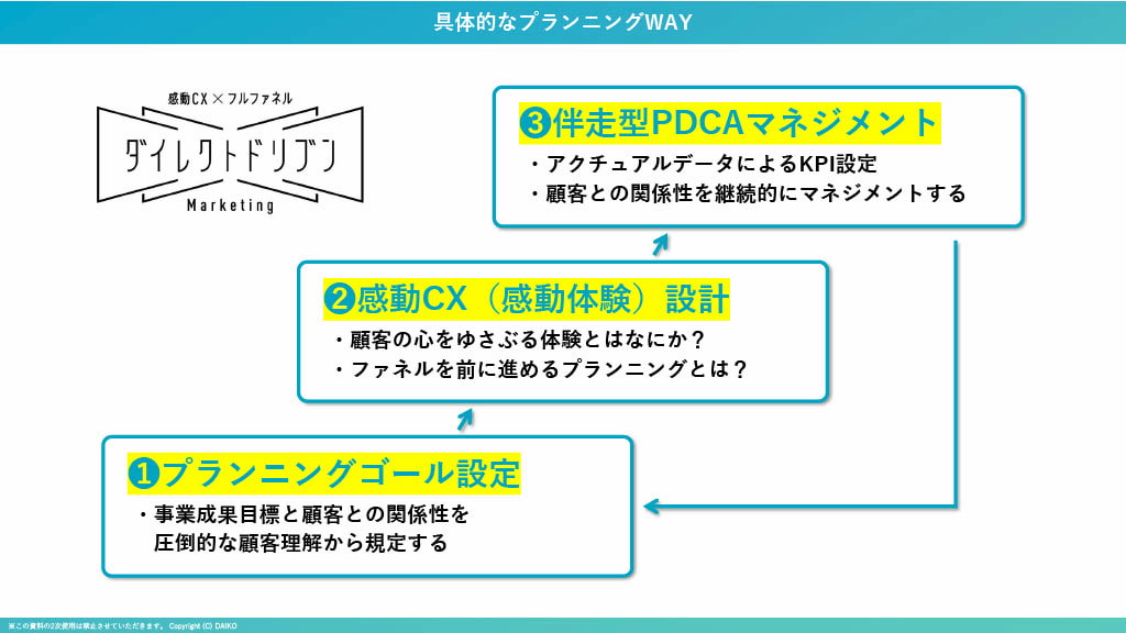 ダイレクトドリブン・マーケティングは、戦略策定・体験づくり・PDCAという3つのステップからなる。マヨ渋は、このうち2つ目の「感動体験の設計」に該当する。