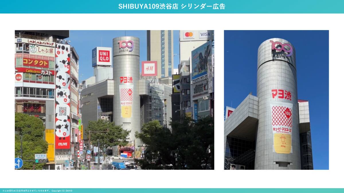 象徴的な施策がSHIBUYA109渋谷店のシリンダー広告だ。「マヨ渋」という言葉と巨大なマヨネーズのみという大胆な構成がインパクトを生み、山手線からの景観そのものが体験となった。