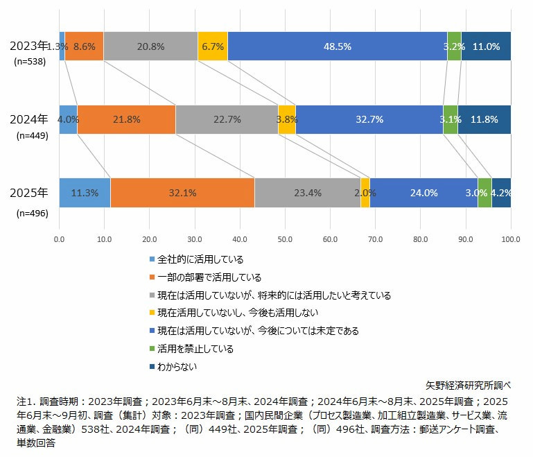 調査では、回答した496社のうち、生成AIを全社的に活用している企業が11.3%、一部の部署で活用している企業が32.1%で、合わせて43.4%の企業が生成AIを業務で活用していることが明らかになった。これは2024年調査の25.8%から17.6ポイント増加し、急速な普及を裏付けた。