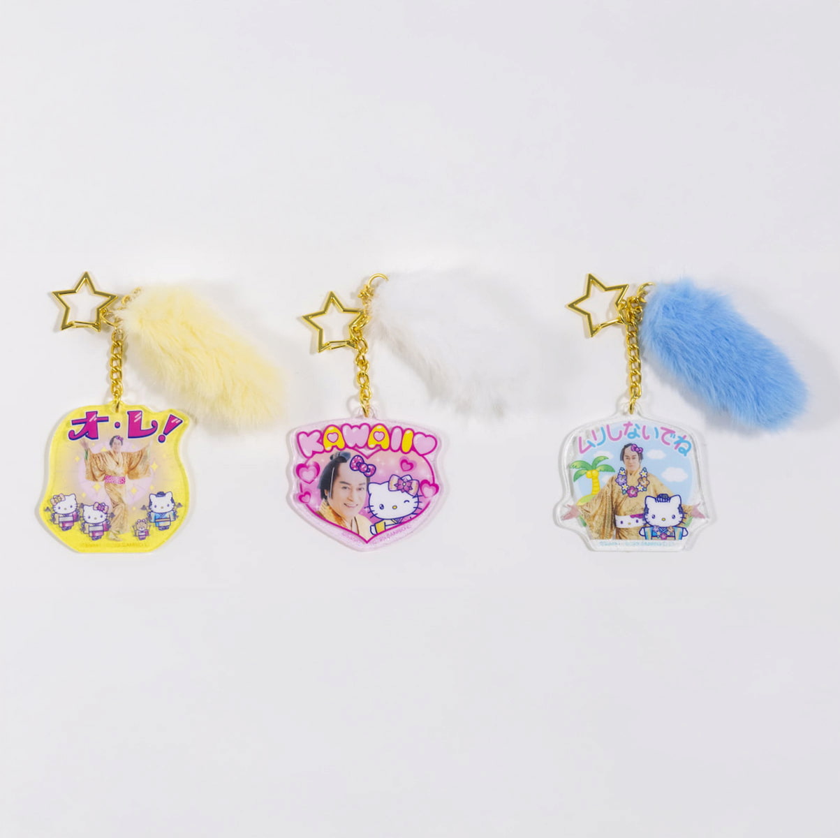 松平さんとハローキティのオリジナルデザインを施したラメ入りのキラキラアクリルキーホルダー。平成ギャルグッズをイメージし、当時流行したしっぽ風チャームやホログラムでキラキラに仕上げたステッカーをラインアップした。