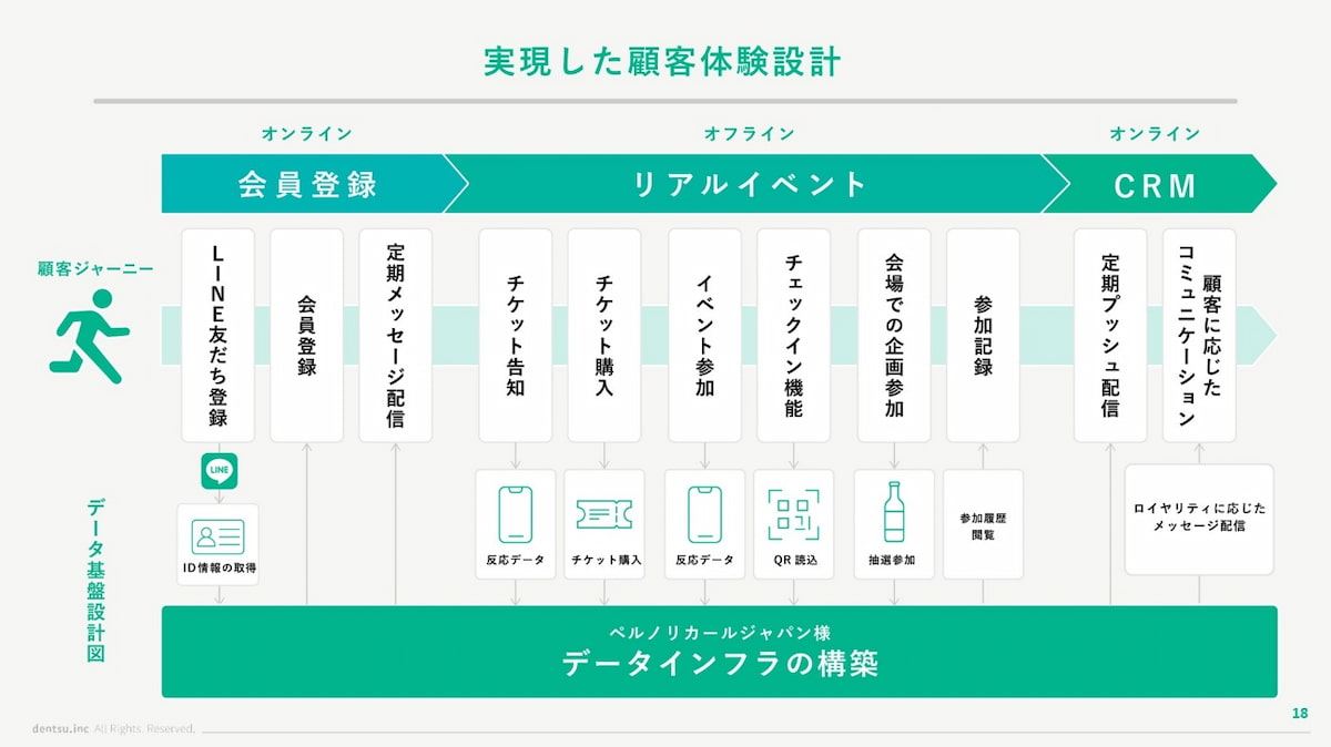 プラットフォームとして選ばれたのは、アクティブ率の高さと顧客層の広さからLINEだった。そして、O2O CRMを実現するツールとして、電通と電通デジタルが提供するLINEのAPIサービスが採用された。これにより、あらゆる顧客接点でデータを蓄積し、活用する基盤が整えられた。