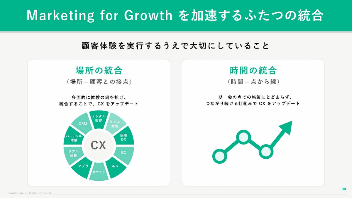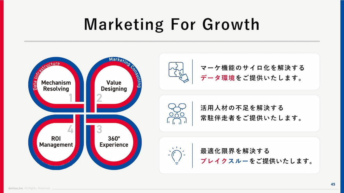 電通が推進する事業成長支援「Marketing For Growth」は、データインフラの構築から、長期的なコンサルティングによる伴走まで、クライアントの課題に深く寄り添うことが特徴である。こうしたブレークスルー事例がここから数多く生まれている。