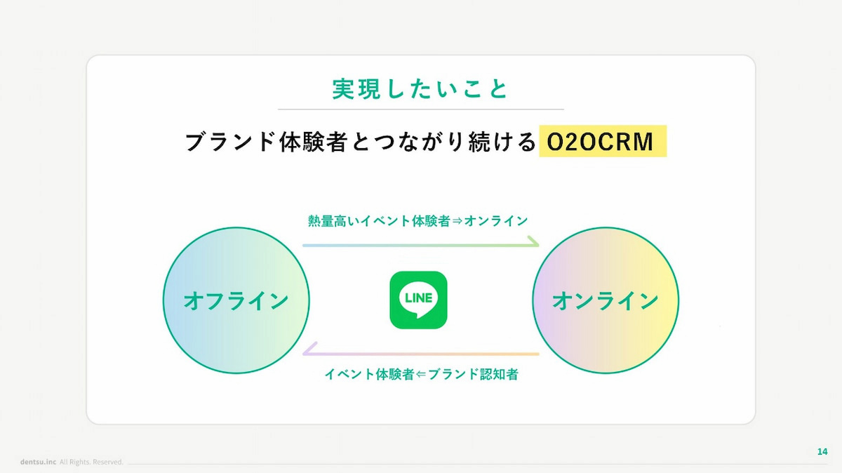 この課題に対し、電通はブランド体験者と「つながり続ける」ためのO2O(Online to Offline)CRM戦略を提案。オフラインのイベント参加者をオンラインで継続的にフォローし、逆にオンラインでブランドに触れた新規顧客をオフラインの体験へと誘導する。この双方向の循環を生み出すことで、顧客との関係を深化させることを目指した。