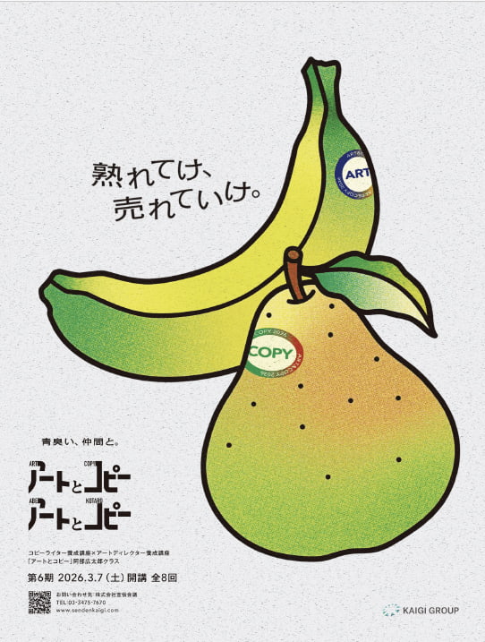 第6期「アートとコピー」が2026年3月7日(土)から開講します。この講座は、コピーライターとデザイナーが毎回別のコンビを組み、課題に取り組む全8回のクラスです。ときには、制作したクリエイティブを全員で審査し、コンビ同士で競い合うこともあります。より成長したいと考えているデザイナー、アートディレクター、コピーライター、プランナーの方々におすすめです。
