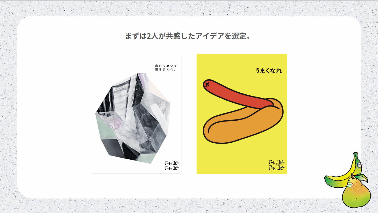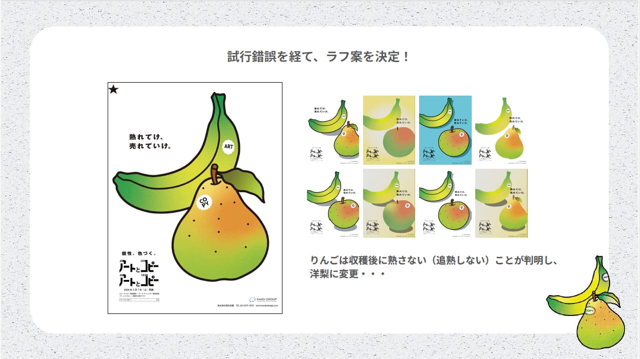 だけど、アートとコピーではコピーの見せ方に関しても議論していきます。そこで、私自身にもイメージやアイデアがないと、話が膨らんでいかないことを実感しました。どちらの良さもあると思うので、都度検証していきたいです。
