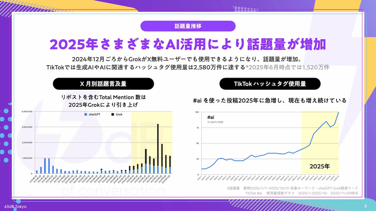 トレンドキーワードの中でも顕著な存在感を示した「AI」は、話題量・心理的影響・文化変容のすべてにおいて例年にない伸びを示した。Xでは、2024年末にGrokが無料ユーザーへ開放されたことを機にAI関連ワードのメンションが急上昇し、TikTokでもAI関連ハッシュタグの投稿数が2580万件(11月20日時点)を突破。AIに関する投稿量は過去最大を記録した。