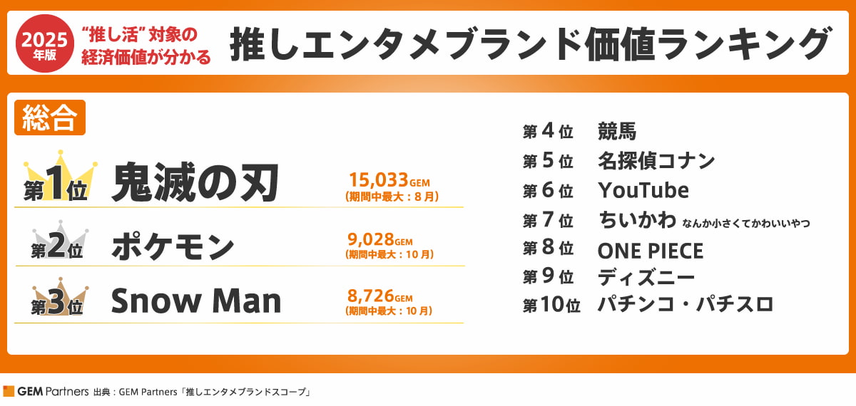 2位は9028GEMの「ポケットモンスター(ポケモン)」でした。最大月となった10月の16日に家庭用ゲーム『Pokémon LEGENDS Z-A』が発売され、「推しファン人数」が2021年1月の調査開始後の最高値を記録しました。3位には8726GEMの「Snow Man」がランクイン。最大月を記録した10月に、5thアルバム『音故知新』の特設サイト開設や最新曲の先行配信に加え、11月~26年1月開催の5大ドームツアーが控えるなど、推し活の意欲が高まる話題が集中しました。