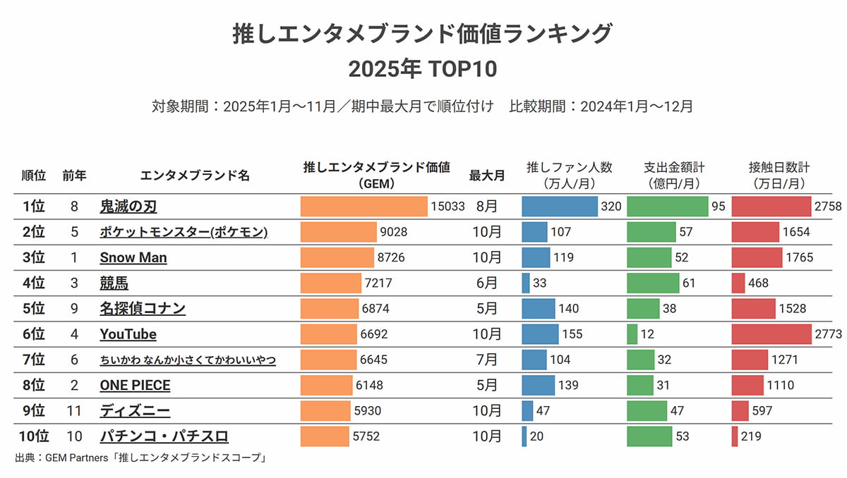 一方で、総合ランキングTOP10の顔ぶれに注目すると、前年から大きな入れ替わりはありません。来年は勢力図を塗り替えるような、新たなエンタメブランドのランク入りがあるのか、今後の展開が注目されます。