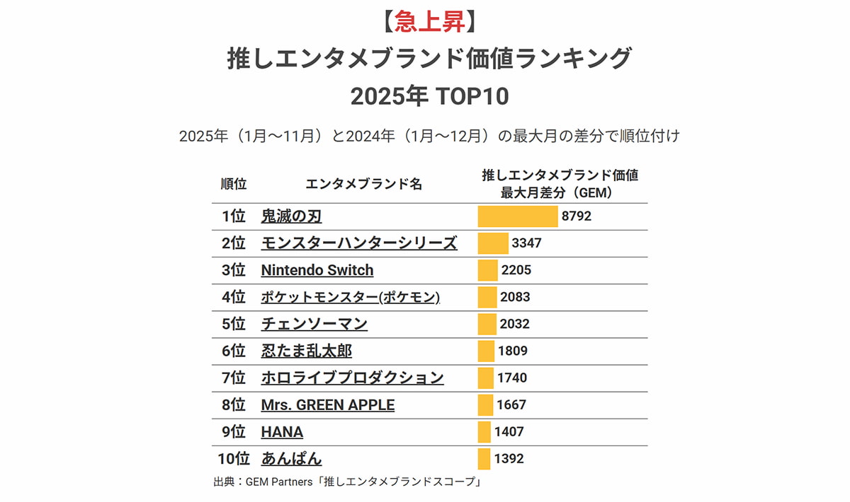 2025年の「推しエンタメブランド価値 急上昇ランキング」の1位は、前述の総合ランキングでも首位を獲得した「鬼滅の刃」でした。続く、2位~4位にはゲーム関連のエンタメブランドがランクイン。2位の「モンスターハンターシリーズ」は2月にシリーズ最新作『モンスターハンターワイルズ』がリリース、3位の「Nintendo Switch」は6月に発売された次世代機「Nintendo Switch 2」が話題に、4位の「ポケットモンスター(ポケモン)」は10月に最新タイトルが発売されました。5位に入ったのは「チェンソーマン」。9月の『劇場版チェンソーマン レゼ篇』の公開が推しエンタメブランド価値を押し上げました。