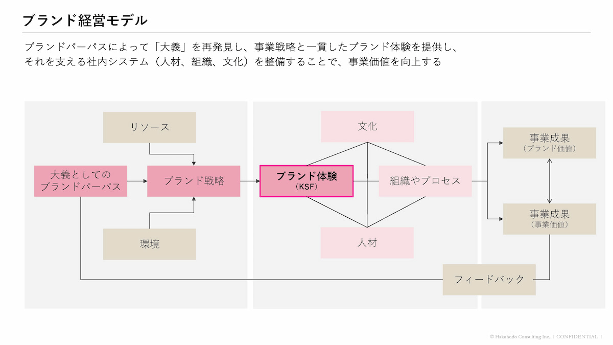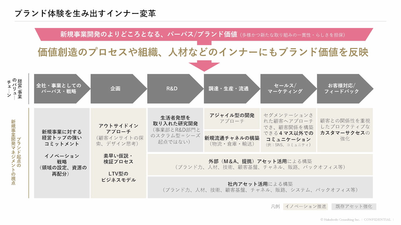 また、既存事業のテコ入れやリブランディングにおいては、短期的なプロモーションやPR施策で課題を乗り越えようとするのではなく、ブランドの価値そのものを時代に合わせて再定義し、顧客体験やサービス全体、ときには価値創造のプロセスや組織体制まで見直すといった、より本質的なアプローチを重視する。