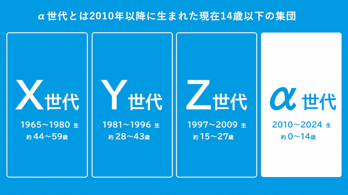 若者たちの行動を捉えるため、多くの企業が「Z世代」というキーワードに注目してきた。ここでいう「α世代」とはZ世代のさらに下に位置する集団であり、2010年以降に生まれた現在14歳以下の世代を指す。上の世代から見ると「若者」として一括りにされがちだが、コロナ禍、教育現場のデジタル化、生成AIの普及など、Z世代とは異なる環境で幼少期を過ごしたα世代は新たな価値観や行動特性を身につけている。
