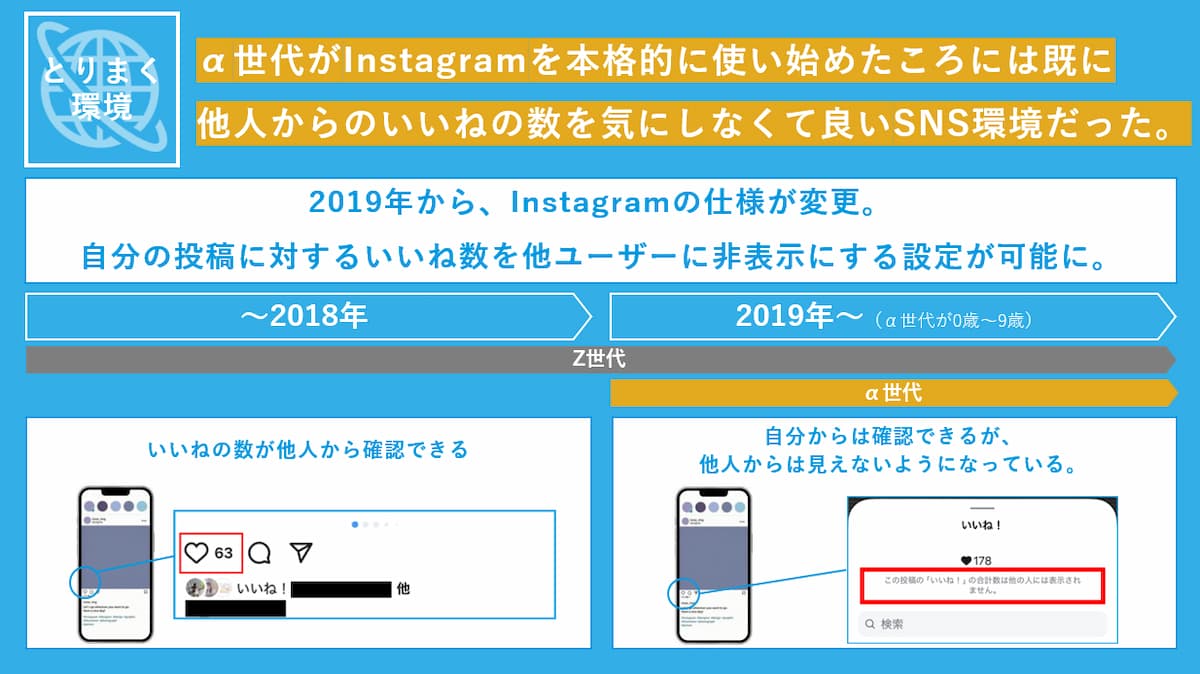 Z世代では「インスタ映え」という言葉が流行し、他人からどう思われるかを重視して競うようにSNSでの発信が行われた。もちろんα世代もSNSでの発信は行うが、「インスタ映え」は死語となりつつあり、“映え”よりも自分が投稿したいものを投稿するといった使い方に変化しつつあるという。