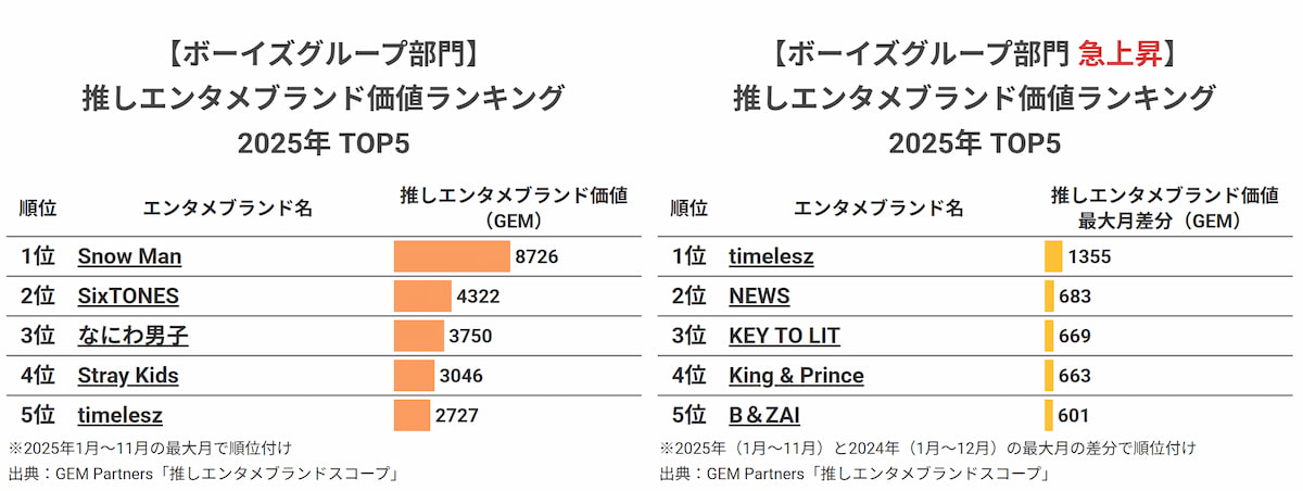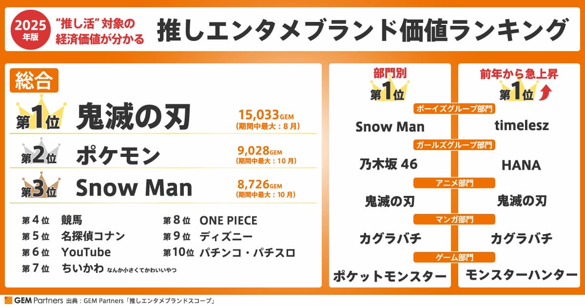 1万2000超のエンタメブランドを横断分析した「推しエンタメブランド価値ランキング」の総合ランキング(前編)では見えにくい「推し方の違い」は、ジャンル別に分解するとより鮮明になる。ボーイズグループでは「Snow Man」が盤石の強さを見せ、ガールズグループでは坂道シリーズが安定した支持を獲得。アニメやゲームでは、話題作の登場がファンの行動を一気に押し上げる構図も確認できた。部門別ランキングを通じて、エンタメごとに異なる“熱量の生まれ方”と、2025年の推し活の現在地を掘り下げる。GEM Partners「推しエンタメブランドスコープ」チームからの分析レポートをお届けする(AdverTimes.編集部)。