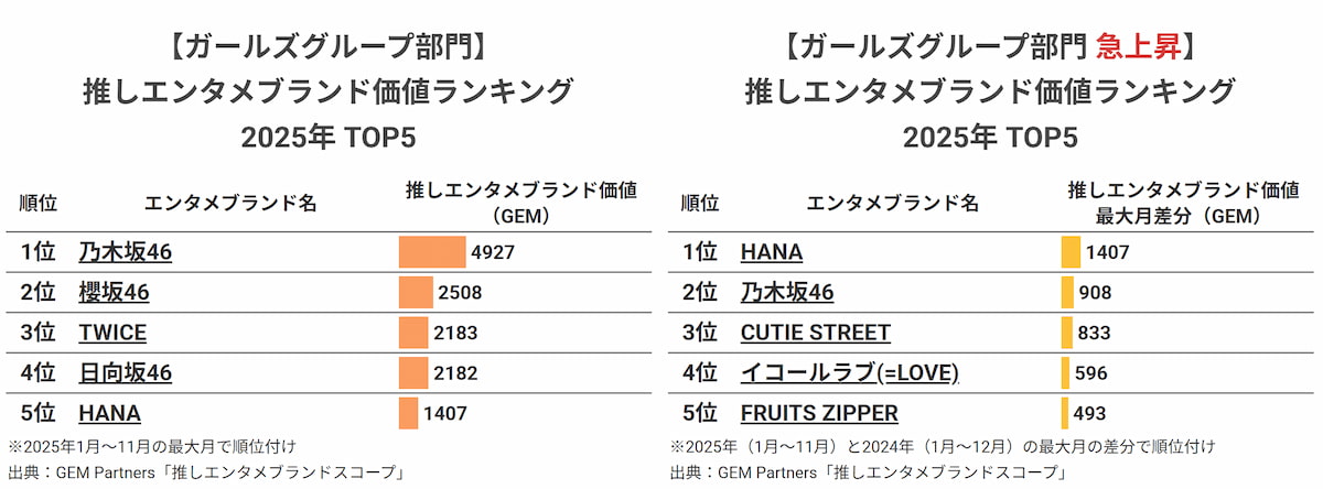 【ガールズグループ部門】坂道が上位占める、急上昇は今年デビューの「HANA」
