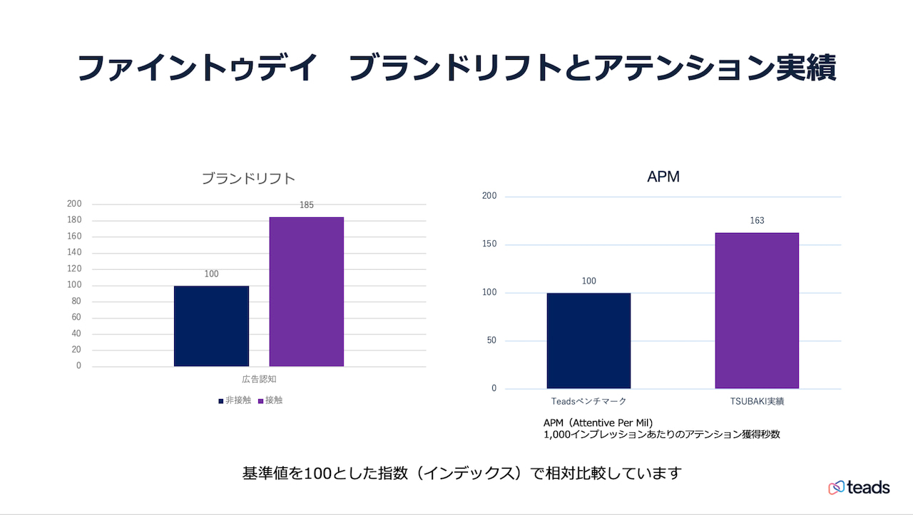 今回のTSUBAKIのアテンション時間(APM=Attention Per Mille 1000インプレッションあたりのアテンション秒数)はTeadsのベンチマークと比較し、60%アップしていることが分かった。先述のブランドリフトとこのアテンションの関連性が見えたことも今回のキャンペーンで特筆すべき点といえる。