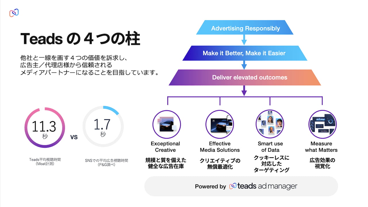 広告配信の品質は、ユーザーの広告体験に直結し、ブランド価値にも影響する。グローバルでTeadsのインリード広告は視聴時間が11.3秒といわれている。これは一般的に3秒程度とされるインフィード広告の3倍以上にも及ぶ。ブランドセーフティの保障がある環境下で、ユーザーにとって自然な形で注視される広告を掲載できるというのが、Teadsの最も大切にする部分だという。