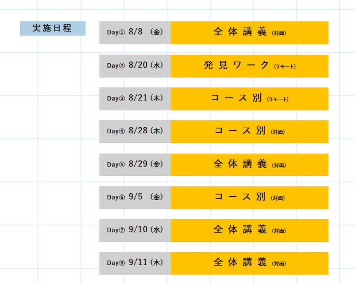 8日間で、コース固有の課題6個・全体の課題3個の計9個のアイデア出し課題に取り組んでもらいます。課題は個人で取り組むものが主ですが、表現・未来・熱狂コースごちゃまぜのグループで取り組む課題もあります。多様な考えの学生がアイデアを持ち寄り、化学反応が起きることを体験してもらう狙いがあります。