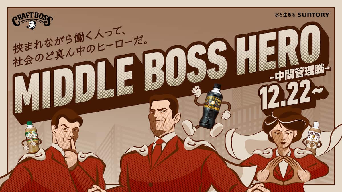 サントリー食品インターナショナル「クラフトボス」は12月22日、 “一年間なにかに挟まれながらも懸命に働いてきたすべての人”に敬意を込めたコミュニケーション企画「MIDDLE BOSS HERO ~中間管理職~」を開始した。期間は12月28日まで。
