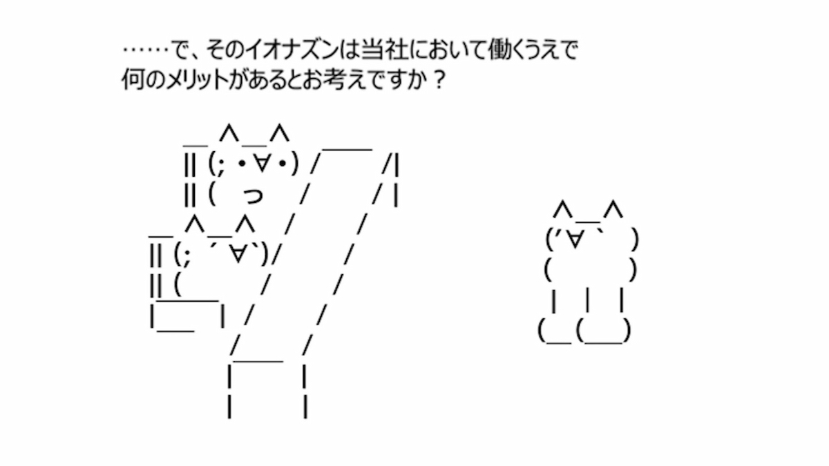 今回の動画は、その2ちゃんねる文化を忠実に再現している。映像はアスキーアート調で構成され、面接官と受験者もモナーの姿で登場する。3人の人気声優が、定番のやり取りをそのまま演じている点が特徴だ。