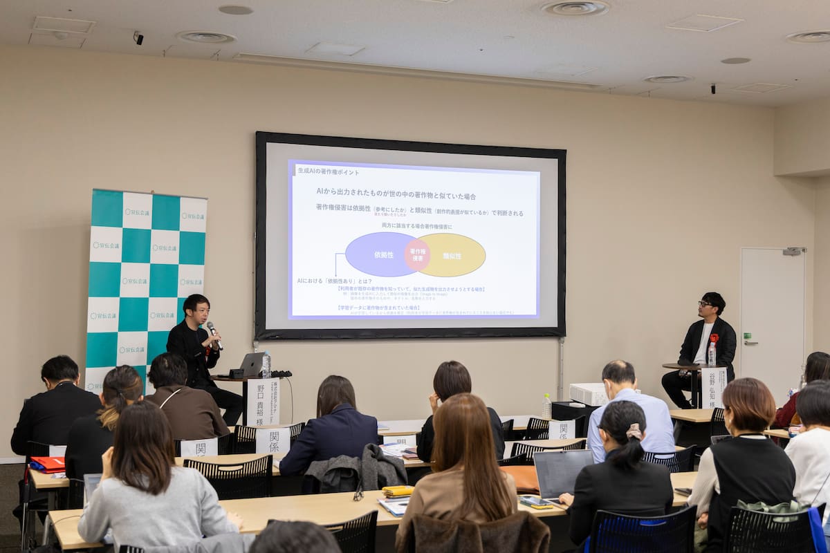 続いては、アマナの谷野弘知氏と野口貴裕氏が登壇し、進化する生成AIを取り巻く著作権リスクや炎上リスクを法的な観点から解説するとともに、クリエイティブ制作における効果的なAI活用法を提示した。
