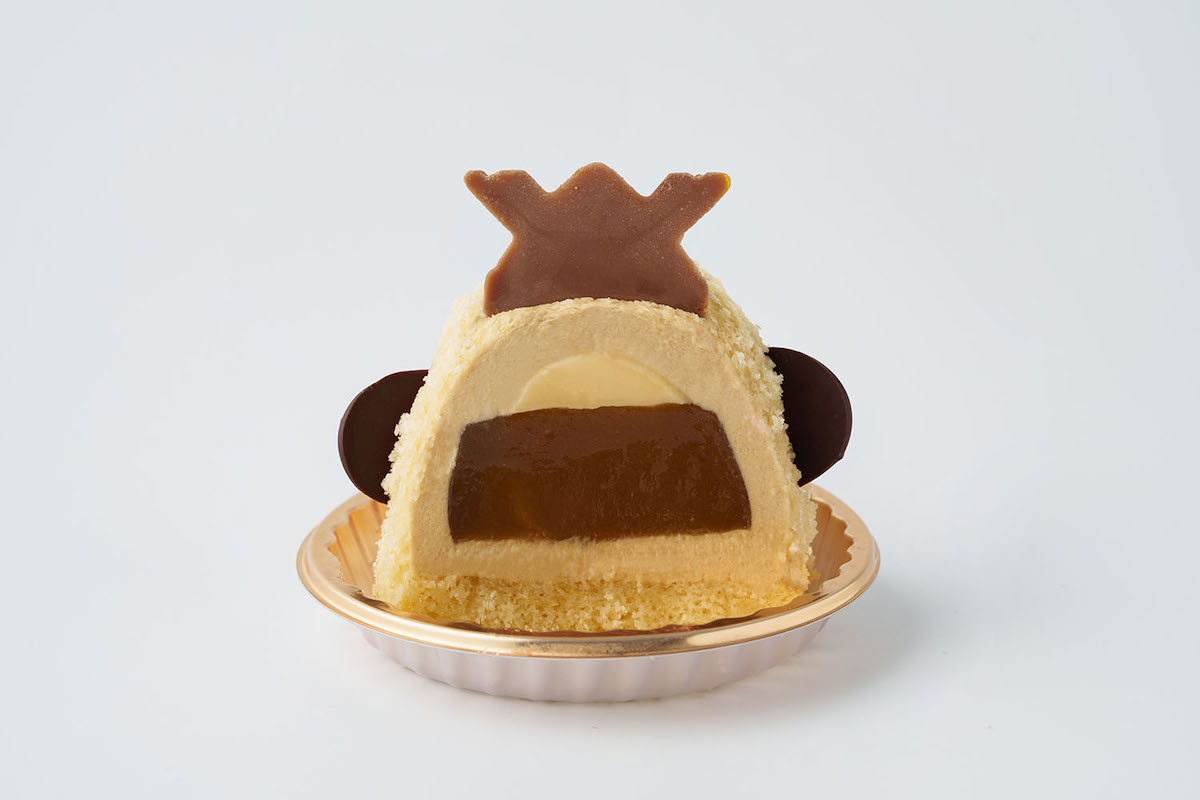 豊臣秀吉をイメージした「豊臣ぴよ吉」は緑茶風味。秀吉が用いたとされる馬印(戦の目印)「千成瓢箪(せんなりひょうたん)」のチョコプレートが添えられている。