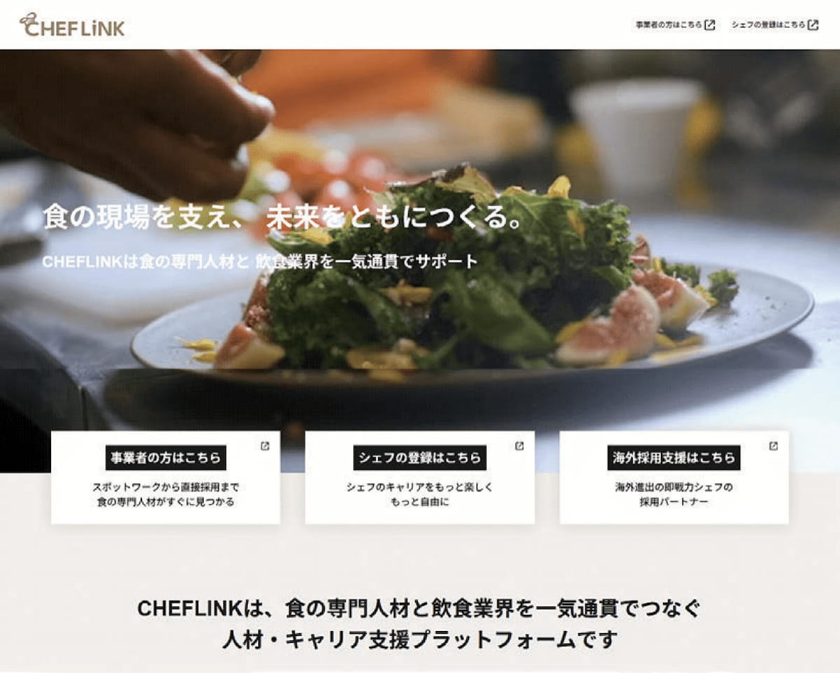 事業概要 食の専門人材と飲食業界をつなぐ人材・キャリア支援プラットフォーム「CHEFLINK(シェフリンク)」/海外採用支援サービス「CHEFLINK GLOBAL(シェフリンクグローバル)」/家庭向けの出張シェフサービス「SHAREDINE(シェアダイン)」 の運営