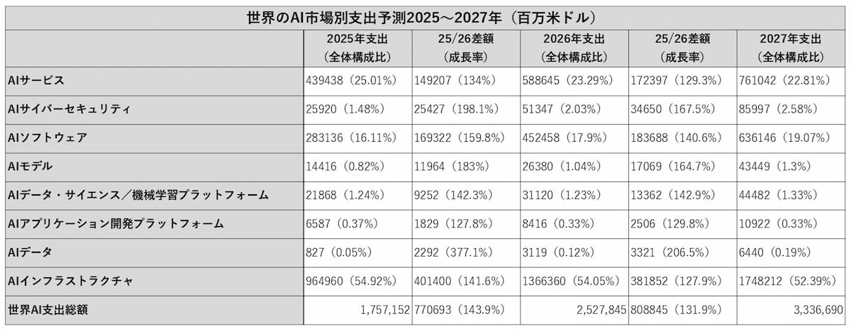 Gartnerの「世界のAI市場別支出予測、2025~2027年(百万米ドル)」よりAdverTimes.編集部が作成