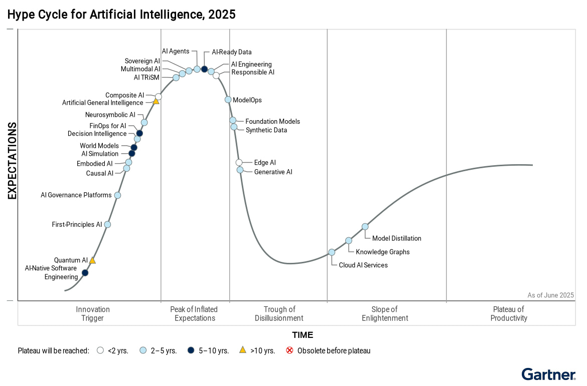 Gartner Hype Cycle Identifies Top AI Innovations in 2025より。2025年時点で生成AIはグローバルで「幻滅期」、AIエージェントは過度な期待の「ピーク期」だった